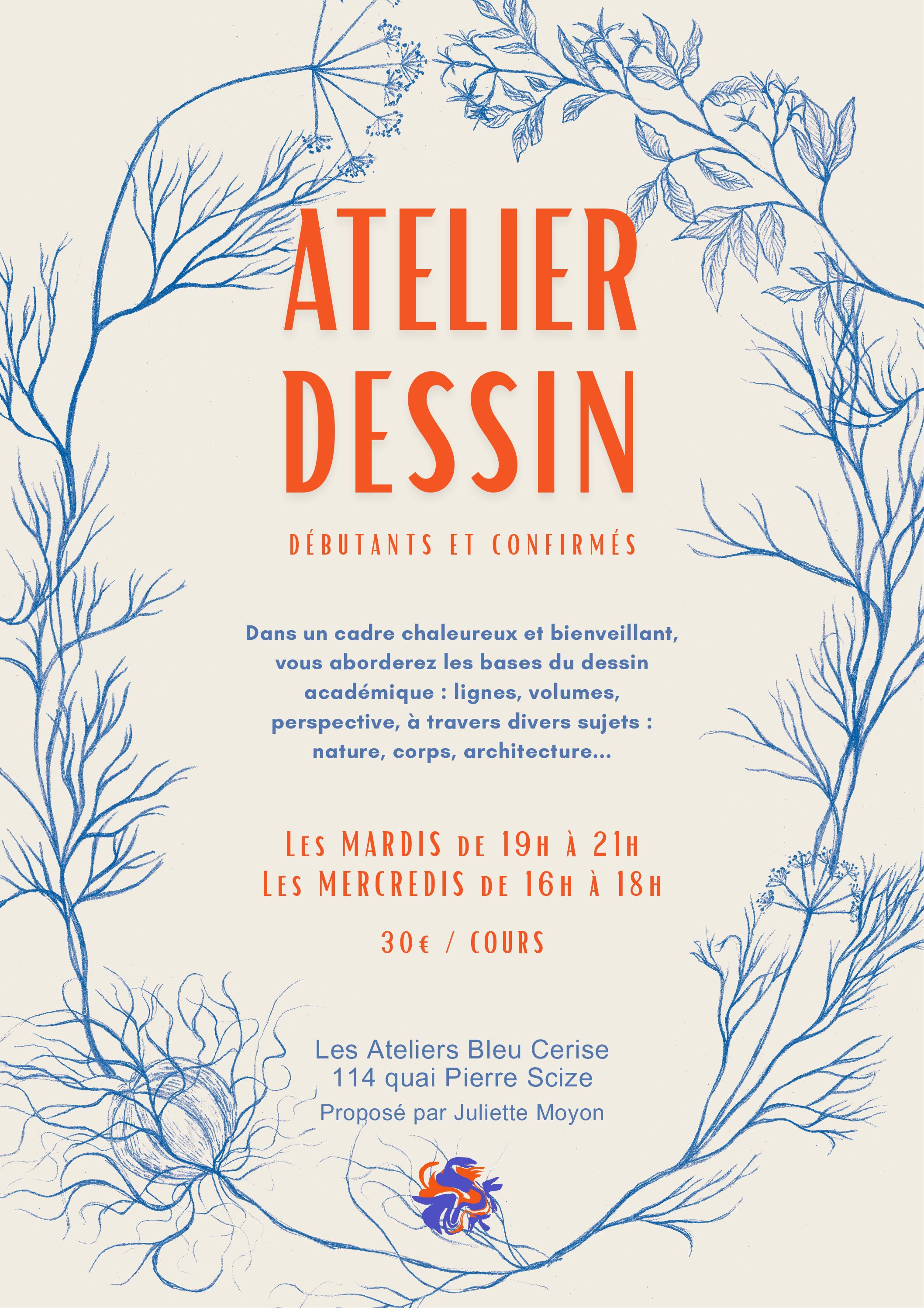 N’hésitez pas à vous inscrire au 06 71 93 63 54 ou sur lesateliersbleucerise@gmail.com, ou juliette.moyon@live.fr.