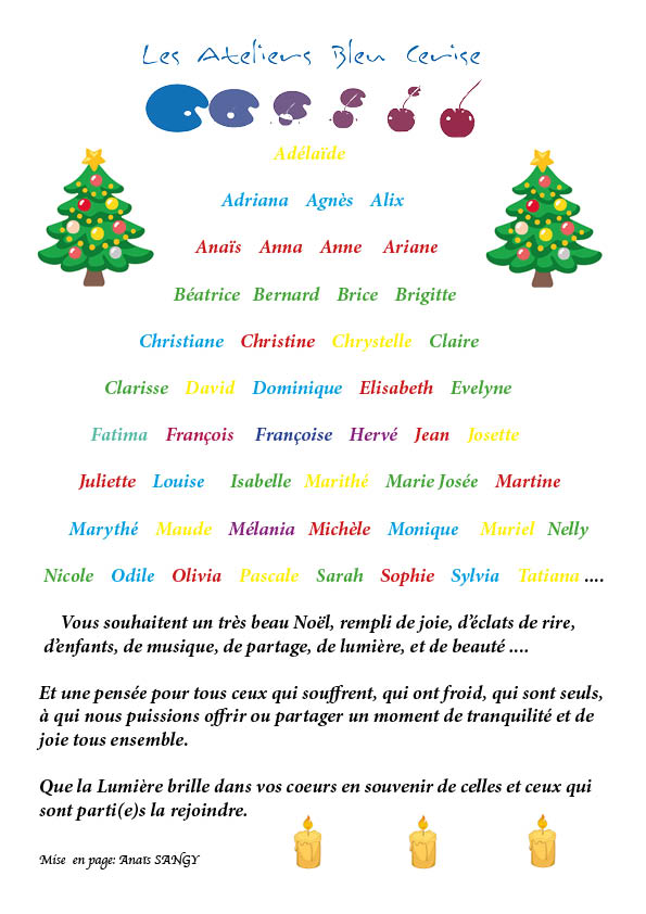 Tous les membres des ATELIERS BLEU CERISE vous souhaitent de passer de très bonnes fêtes de Noël. Nous nous retrouverons le lundi 5 janvier pour une nouvelle année pleine de créativité, de nouveautés, de voyages et de stages divers …. Nous aurons l’occasion d’en reparler.